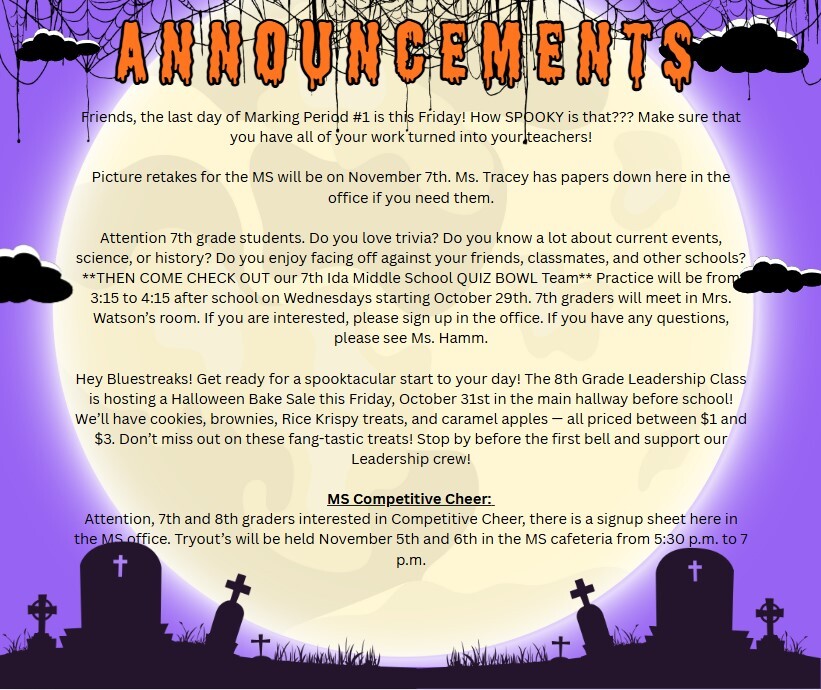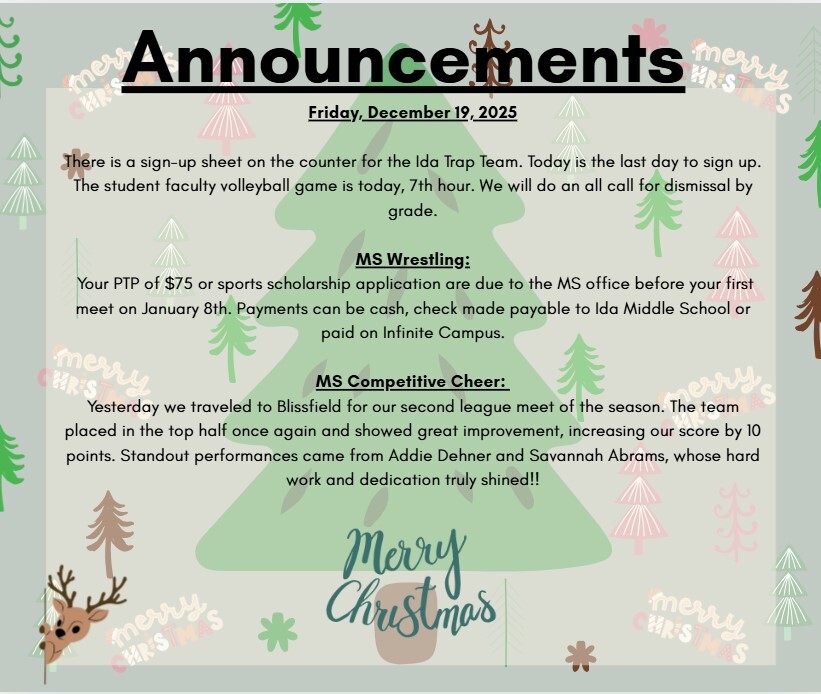 The mission of the Ida Middle School staff is to create a safe, supportive, and conducive environment wherein all students are empowered to become life-long learners. The intellectual, physical, social, and emotional needs of the students will be met with a variety of instructional strategies based on individual needs.